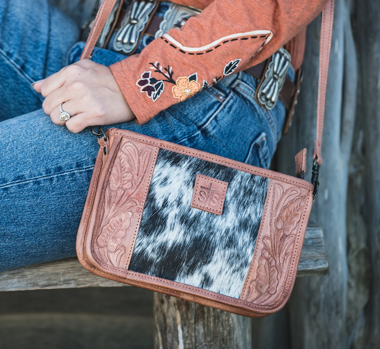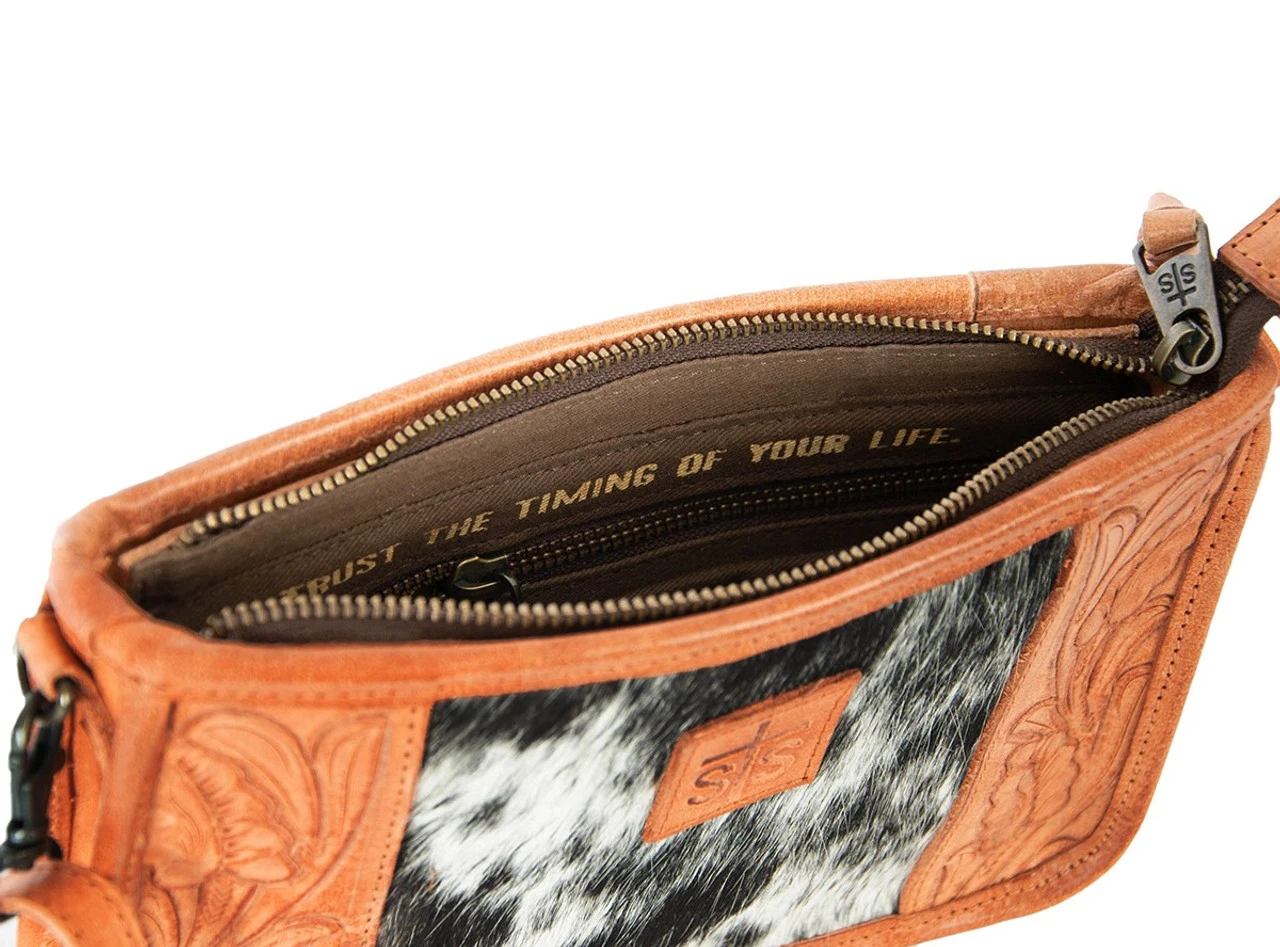 Add a touch of western flair to your getup with the Yipee Kiyay Claire Crossbody Bag. This crossbody bag with adjustable leather shoulder strap for comfortable carrying, interior zippered pocket and inspiration quote on the inside lining is fully functional with just enough room to take all of your Western style on the go.