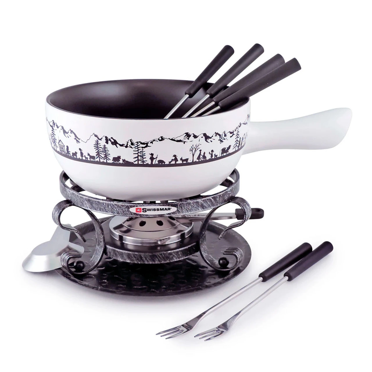 The Swissmar Heidi 9-Piece Ceramic Cheese Fondue Set includes a black ceramic fondue pot, a traditional wrought iron reached, six heat resistant 11-inch stainless steel 3-tine fondue forks with dark wood handles and an 8-hole fondue burner.