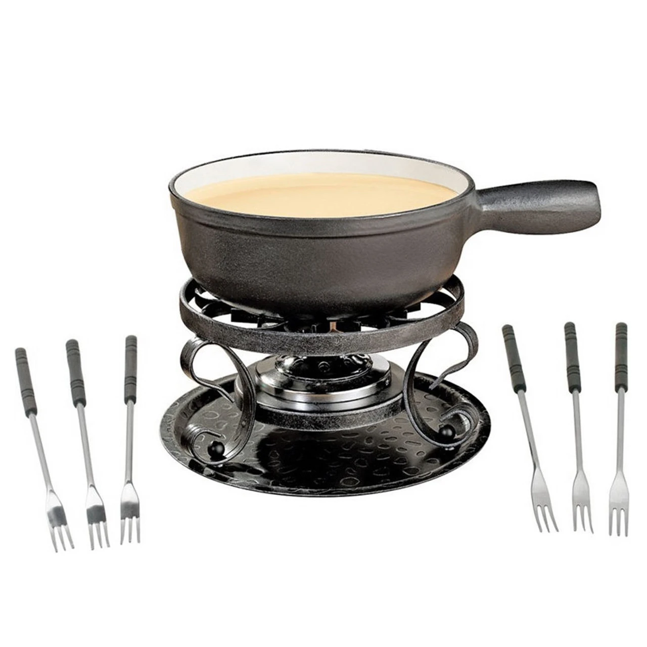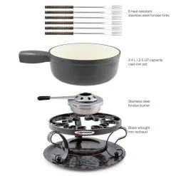 Shaped like a traditional “Caquelon”, the Lugano Cast Iron Fondue Set provides the perfect even heat distribution for cheese fondue. It is ideal for cooking at high and low temperatures. Can be used on all heat sources and is easy to clean. Set includes: cast iron pot (22 cm diameter) – enamelled inside for easy cleaning, wrought iron rechaud with tray, fondue burner, six 3-prong forks with wooden handles. Pot capacity: 2L / 2 QT.