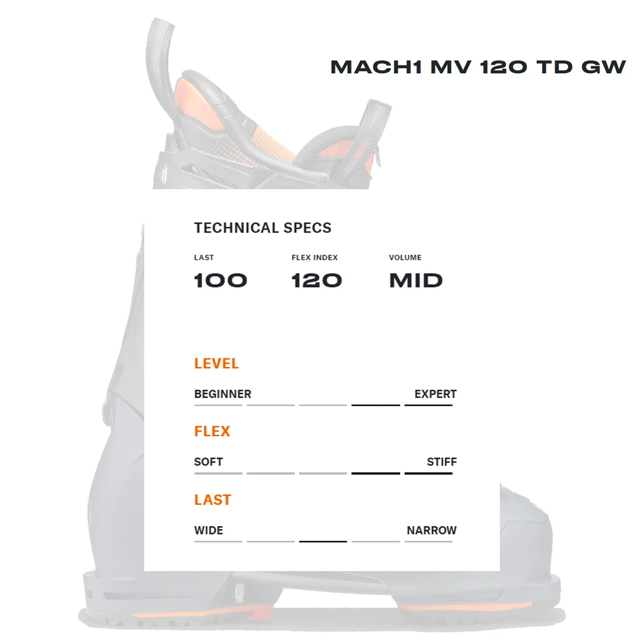 Made for those who get out there whether the snow gods have delivered or not, the Mach1 MV 120 TD is a high-performance ski boot designed for advanced level skiers with medium-volume feet who are looking for all-mountain performance, a comfortable but precise fit and a high level of customization.