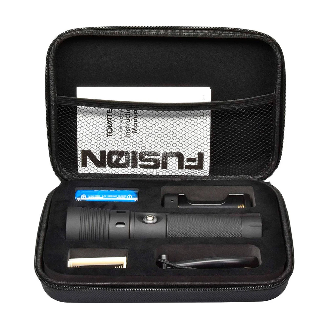 Accepts either AA alkaline batteries (not included) or lithium-ion rechargeable battery. Includes lanyard, 26650 Li-ion battery, charger, USB cable and padded case.