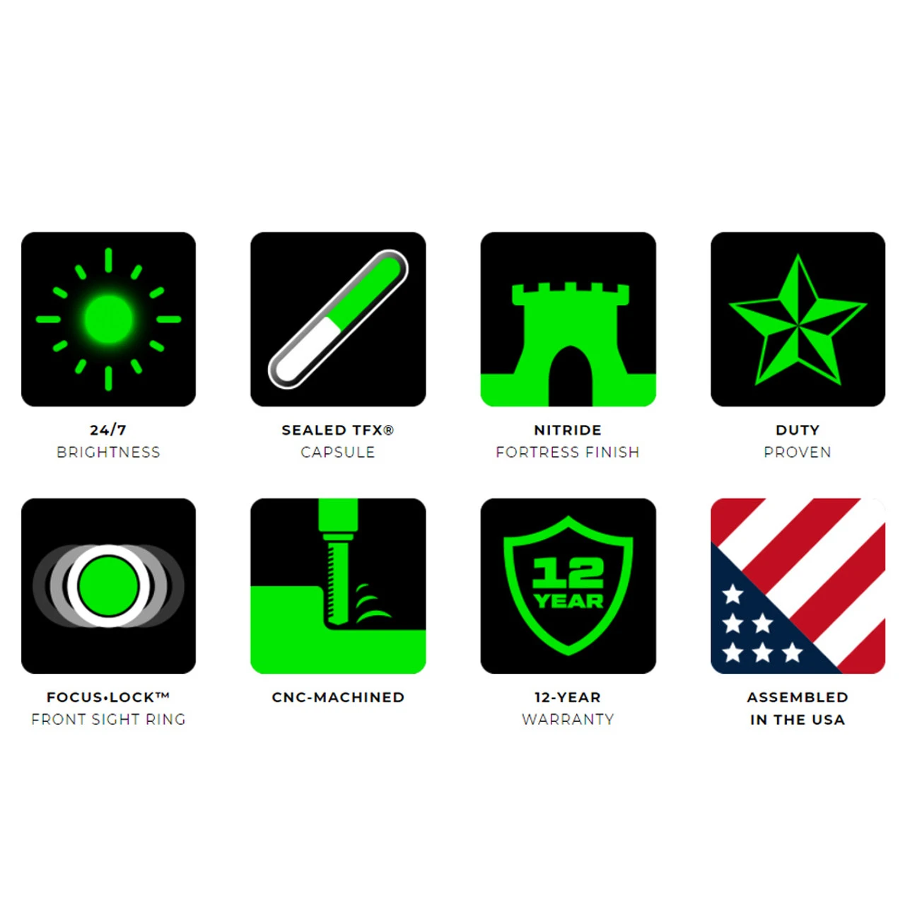 Glowing bright both day and night, TFX sights are always ready. TFX takes the award-winning Tritium + Fiber-Optic technology even further with all the features customers requested: compact snag-free design, longer sight radius, and amazingly durable construction built to handle just about anything. Illuminating elements are encased inside a virtually indestructible chemical and shock-resistant capsule and the CNC-machined steel is protected with a rust-resistant Fortress Finish.