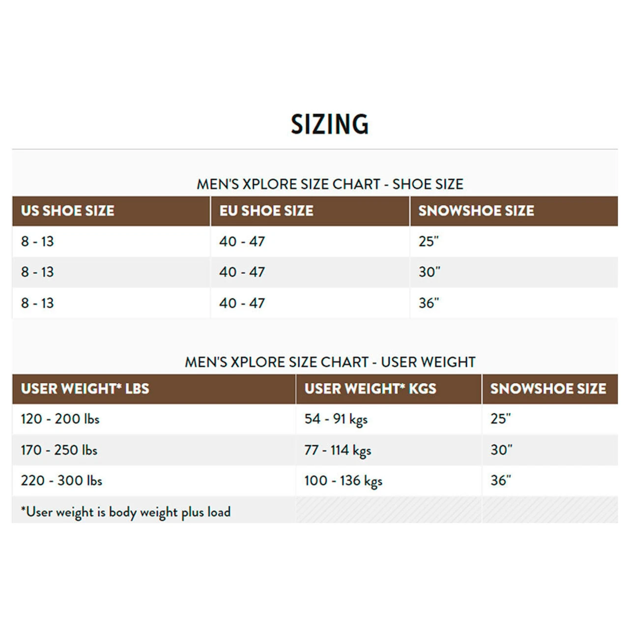 - Kit includes: Xplore snowshoes, 2-piece adjustable snowshoe poles, gaiters