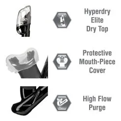 The dry snorkel features TUSA Hyperdry Elite dry top technology that stops water from entering into the snorkel, a drain chamber and purge valve for easy clearing and silicone mouthpiece.