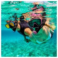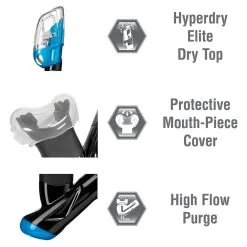 The dry snorkel features TUSA Hyperdry Elite dry top technology that stops water from entering into the snorkel, a drain chamber and purge valve for easy clearing and silicone mouthpiece.