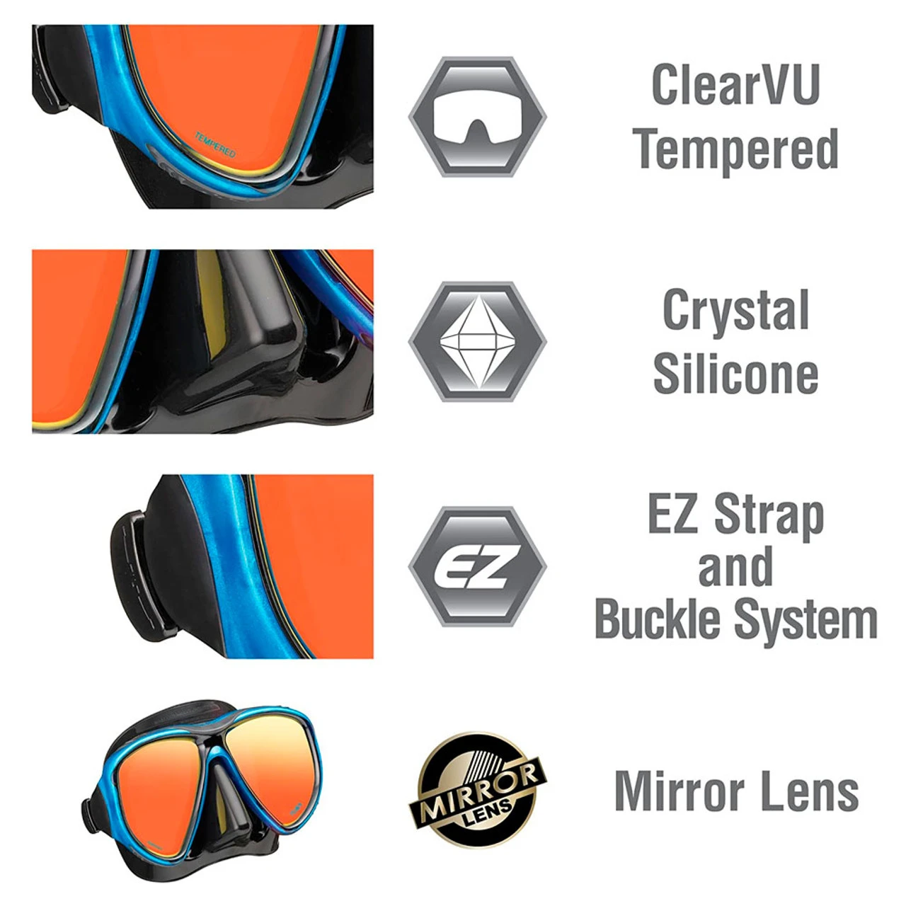 The Powerview Dry Combo includes a high-quality 2-window mask with enhanced vision, EZ adjust buckle technology, ClearVu tempered glass lens with stylish mirror coating, and Pure Silicone skirt and strap.