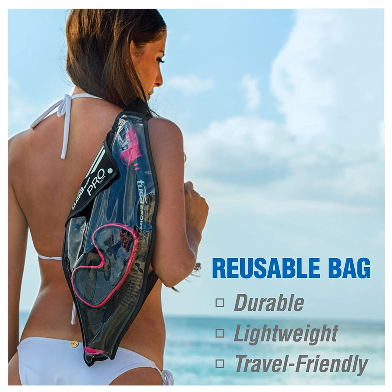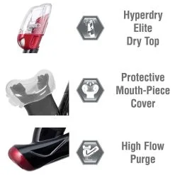 The USP-250 dry snorkel features TUSA Hyperdry Elite dry top technology that stops water from entering into the snorkel, a drain chamber and purge valve for easy clearing, and silicone mouthpiece.