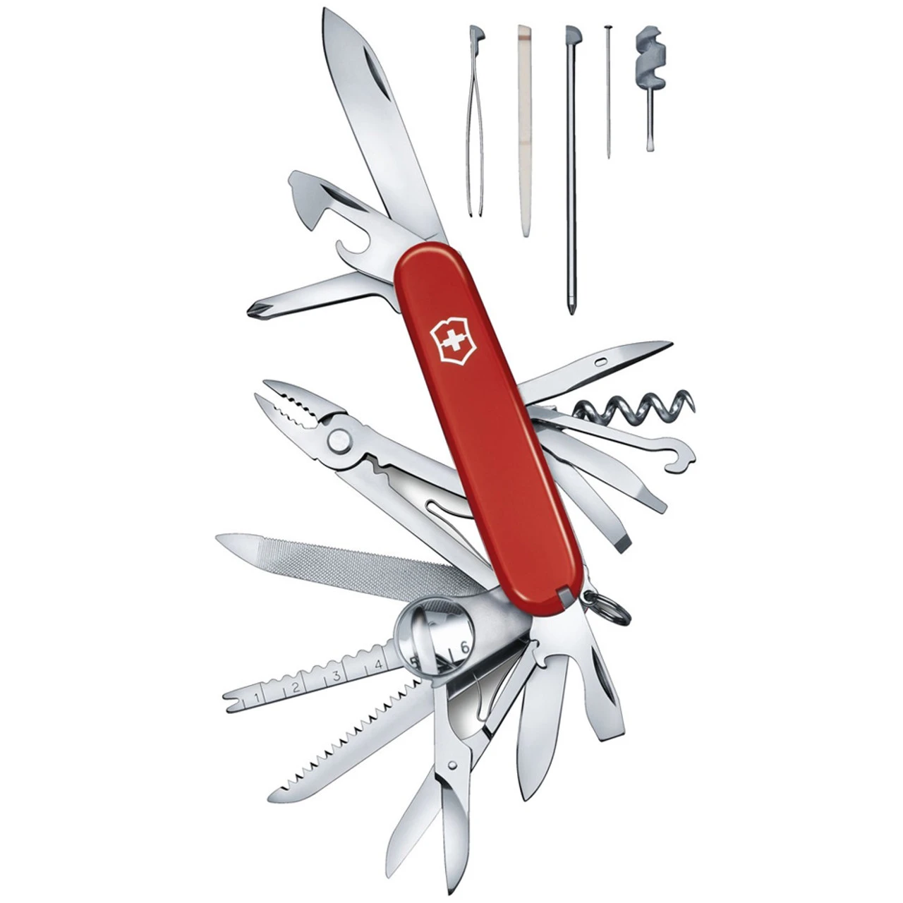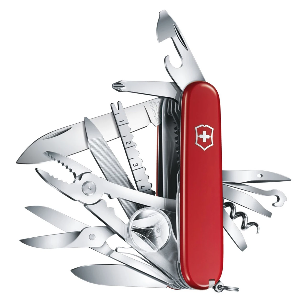 The Victorinox SwissChamp Pocket Knife is the ideal compact multitool to tackle everything from everyday to the worst day. More than capable featuring 33 different tools, the SwissChamp can fix, tweak, assemble, slice, saw, magnify and more! Iconic red celluloid handle with Swiss stainless steel components.