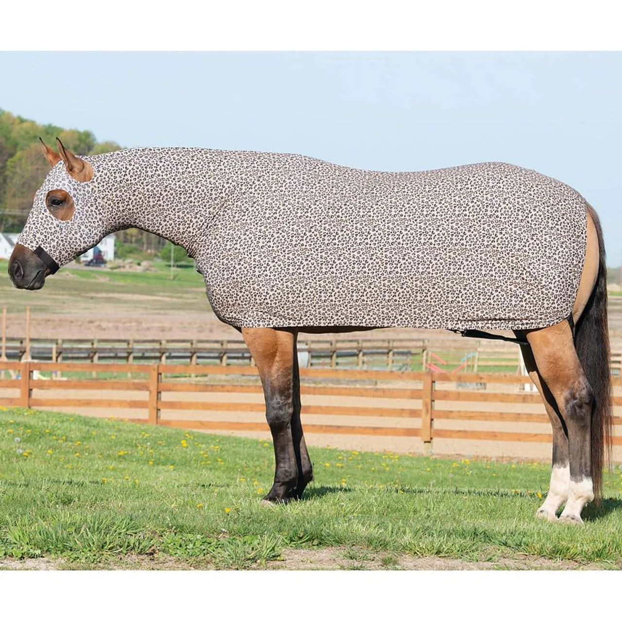 This moisture-wicking EquiSkinz sheet is made from four-way stretch Lycra for a great fit. Features large eye openings, fleece lining at nose and a zipper at front for easy on and off. Two back leg straps with black plastic snaps keep sheet in place. Hook and loop closures provide easy on and off. Size large recommended for horses between 1100 and 1400 pounds.