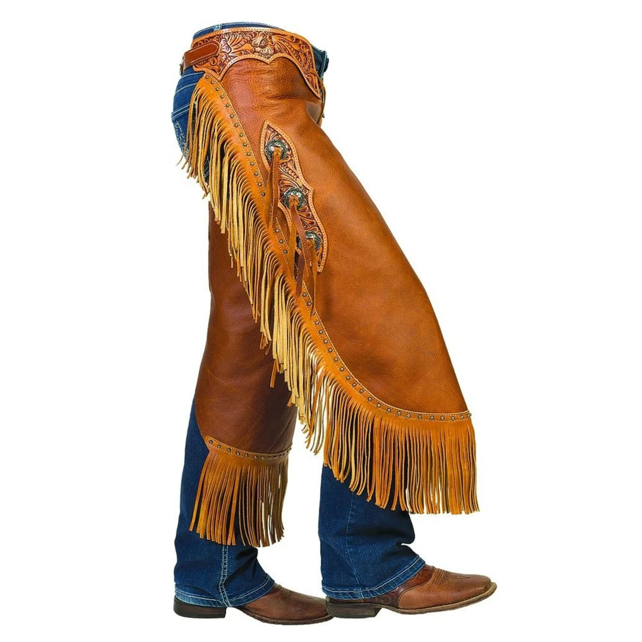 Handcrafted from chrome tanned pull-up leather in rich golden tones, these chinks feature details that turn heads including floral tooled yoke and scallop set, floral conchos with black accents, and sewn-on contrasting fringe outlined with antique silver umbrella spots. Designed for added freedom of movement, they feature adjustable leg straps, back buckle closures and front tie closures to keep these chinks in place.