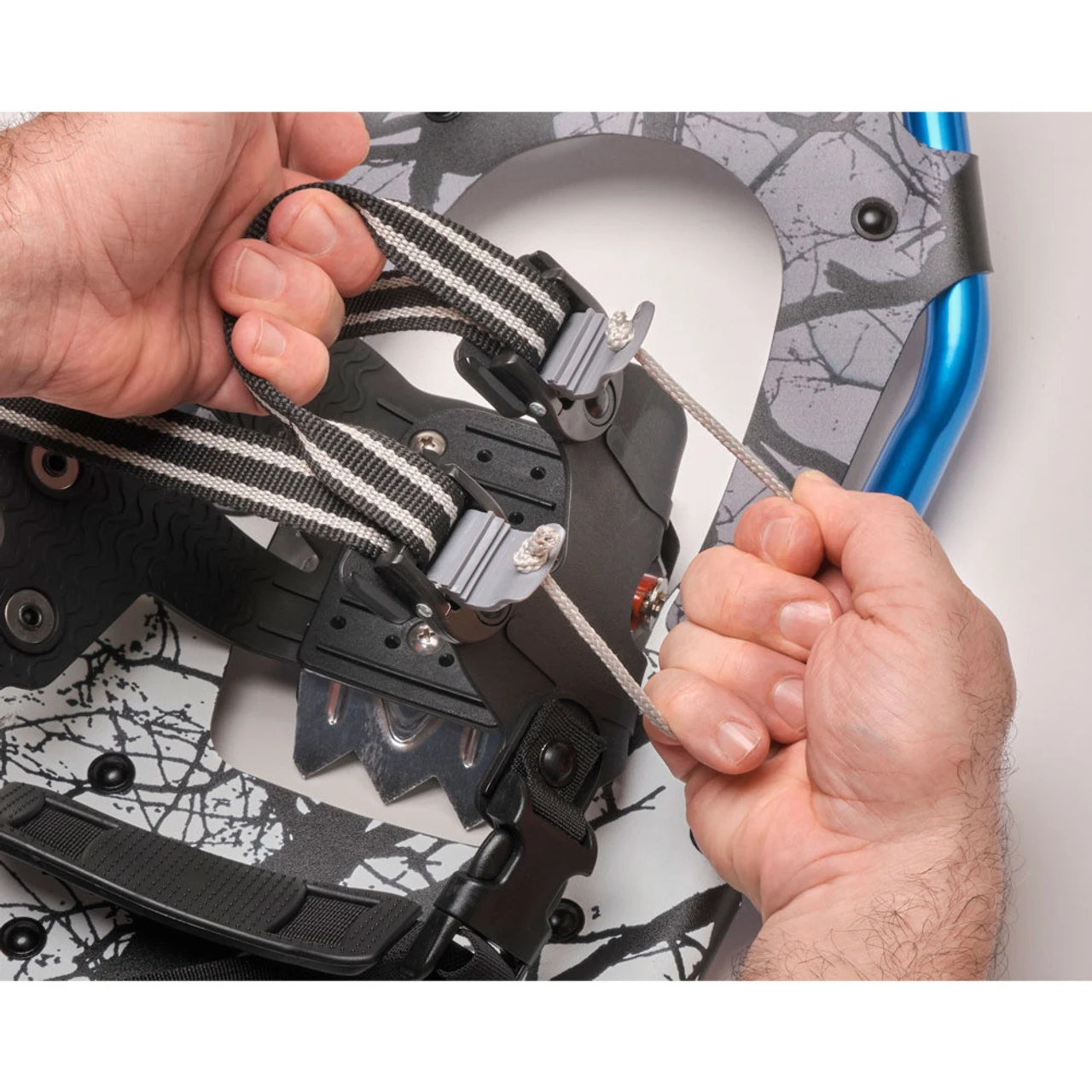 Whitewoods snowshoes are made with aircraft grade 6061 aluminum, 2mm polyethylene decking and reinforced nylon washers all deck rivet locations. All bindings and crampons are mounted with lock nuts, not rivets, so they can be easily maintained.