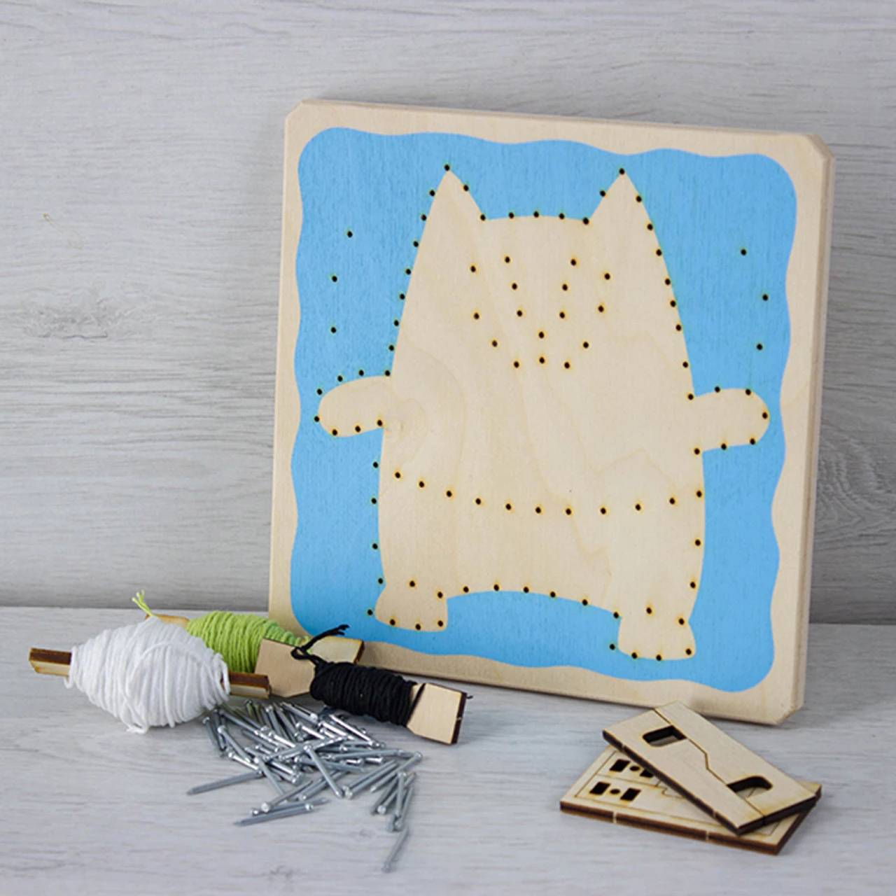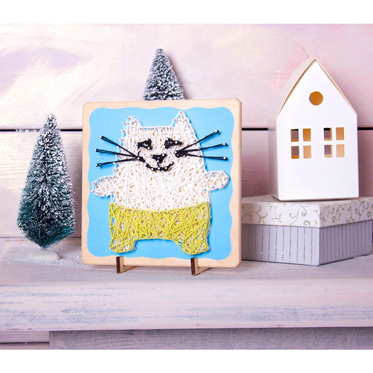 Arts and Crafts kit for children Woodby String-Art Cat is designed for children ages 12 and above. This bright Woodby string art kit brings joy to the whole family. The kit includes: wooden base, a set of nails, safety holders, cotton thread in several colors, desktop clamp, assembly instruction.