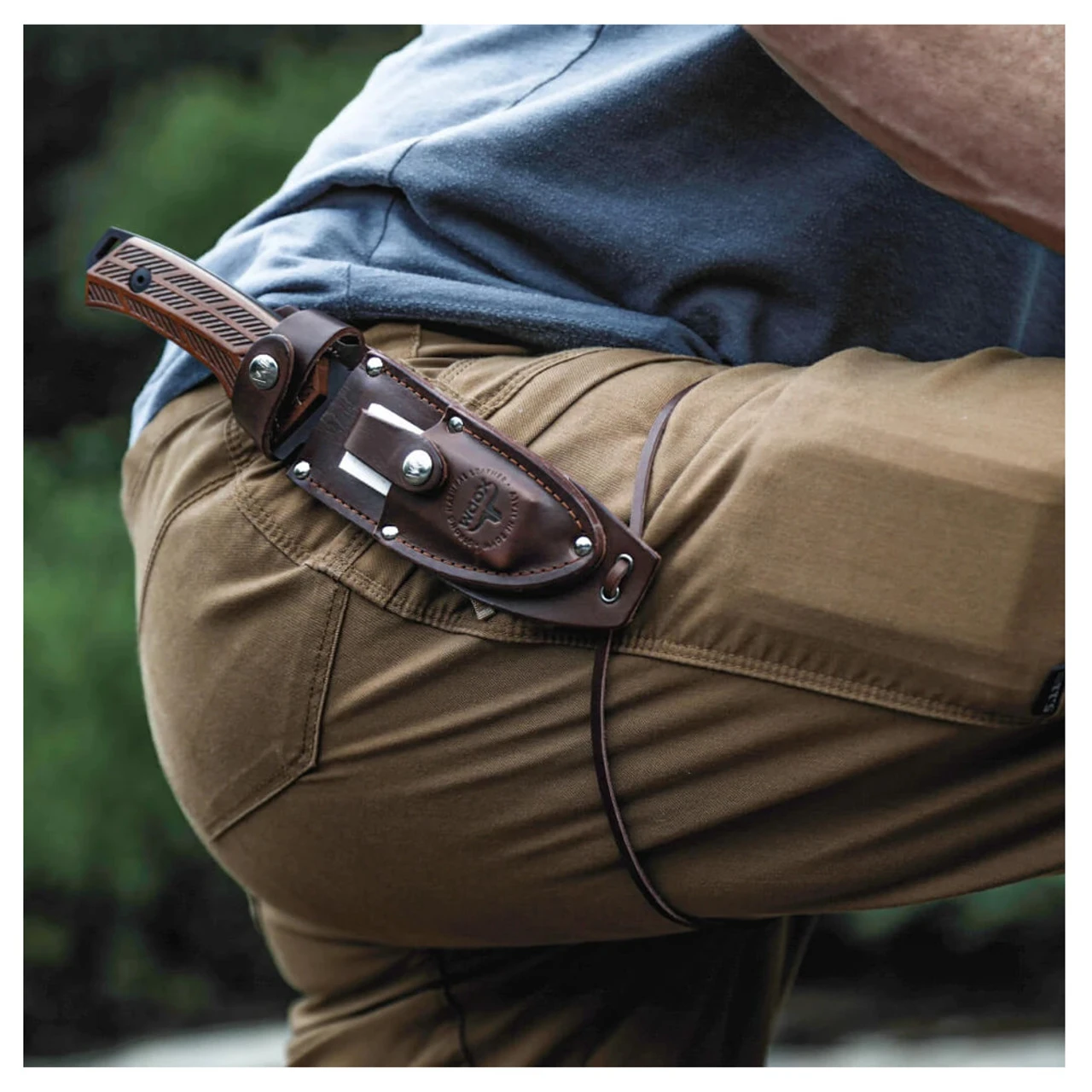 Store your knife in a handmade sheath crafted in Tuscany from genuine Italian leather. Featuring a whetstone pocket, your sheath will hold its own, buckled to your utility belt or backpack out in the field.