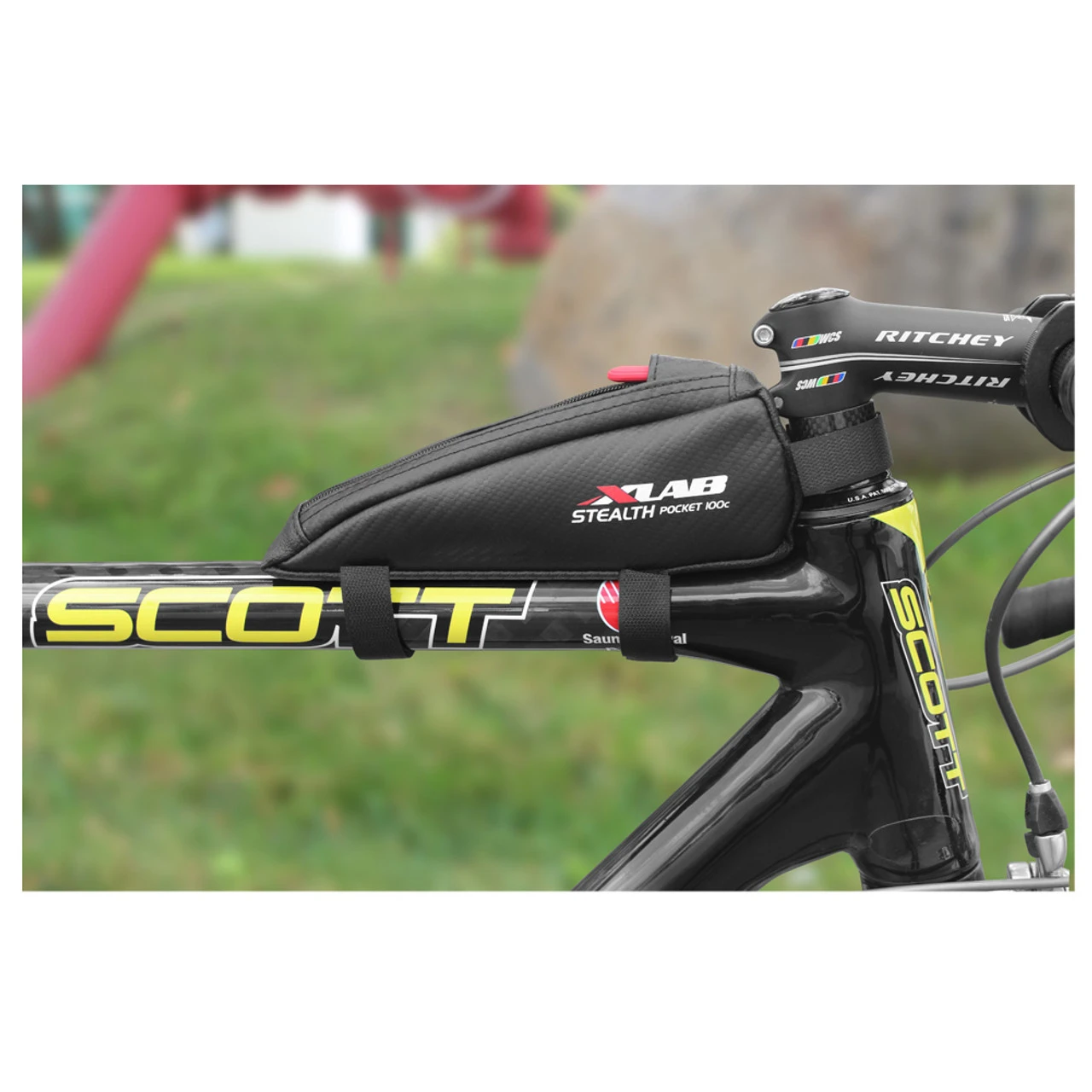 The XLab Stealth Pocket 100c is a top-tube mounted storage optimized to increase aerodynamics for bikes with standard stems. Sleek, element-deflecting material withstands wear, perspiration and electrolyte drinks. Highly visible, silver colored interior makes it easy to see contents and stay focused on the road.